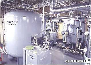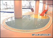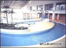 左:全自動砂式ろ過滅菌装置 中央:流水25mプール 右:幼児用プール